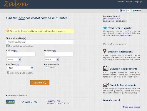 Head on over to Zalyn.com and you can start searching for the best car rental coupon on their homepage.